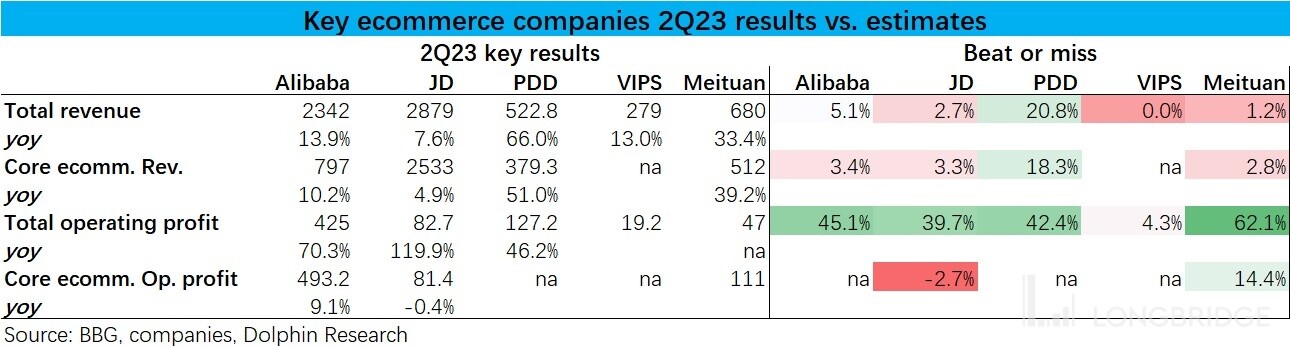 从二季度的实际业绩相比预期的差异来看,同样可见阿里、京东、美团等公司的总营收和核心业务的营收都略超预期(尽管领先幅度不大)。利润层面,除唯品会外其他公司更是普遍高于市场预期 40%-60%,超预期幅度显著。