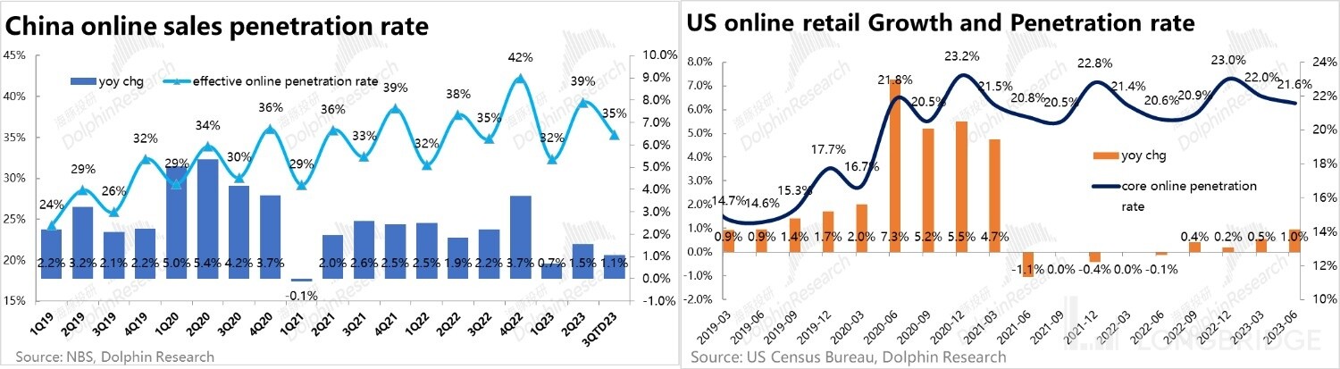 稍感欣慰的是,与美国放开后线上零售渗透率长达数个季度先入负/零增长不同,国内二三季度内线上零售渗透率幅度虽然缩窄但仍在小步上升。即便有线下复苏的不利影响,线上零售领跑整体大盘的相对优势仍在。