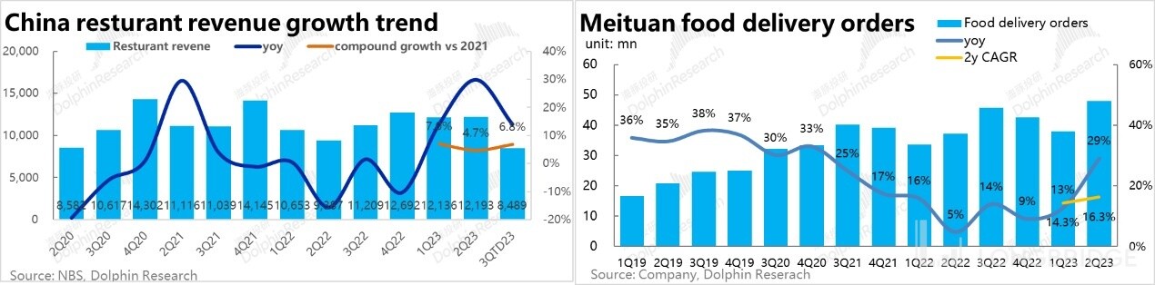 展望后续,进入暑期后,餐饮行业整体三季度(截止 8 月)的 2 年复合增速达到了 6.8%,较二季度的 4.7% 有更明显的提升。但据公司沟通和一些调研来看,三季度内美团外卖单量的增长可能仍相对较弱,线下就餐和旅游需求的复苏对美团核心的餐饮外卖似乎并非利好、倒成了利空。