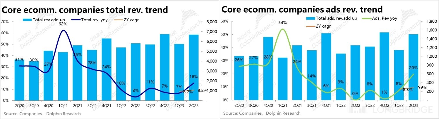 首先,同样剔除 22 年基数波动的影响,看 2021 年至今的 2 年复合增速,可以看到无论在总营收、还是核心广告收入口径下,重点泛电商公司的收入增速在二季度不降反增,都从一季度的 8+% 提速到二季度的 9+%。即在行业大盘增速(对应 GMV)走低的同时,主要电商公司的收入增长却是在改善的。