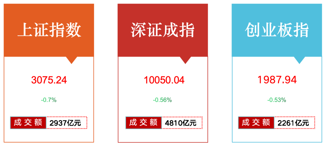 10月10日,大盘全天高开后冲高回落,三大指数均收跌。截至收盘,沪指跌0.7%,收报3075.24点;深证成指跌0.56%,收报10050.04点;创业板指跌0.53%,收报1987.94点。总体上个股跌多涨少,两市超3000只个股下跌。沪深两市今日成交额7747亿,较上个交易日放量47亿。