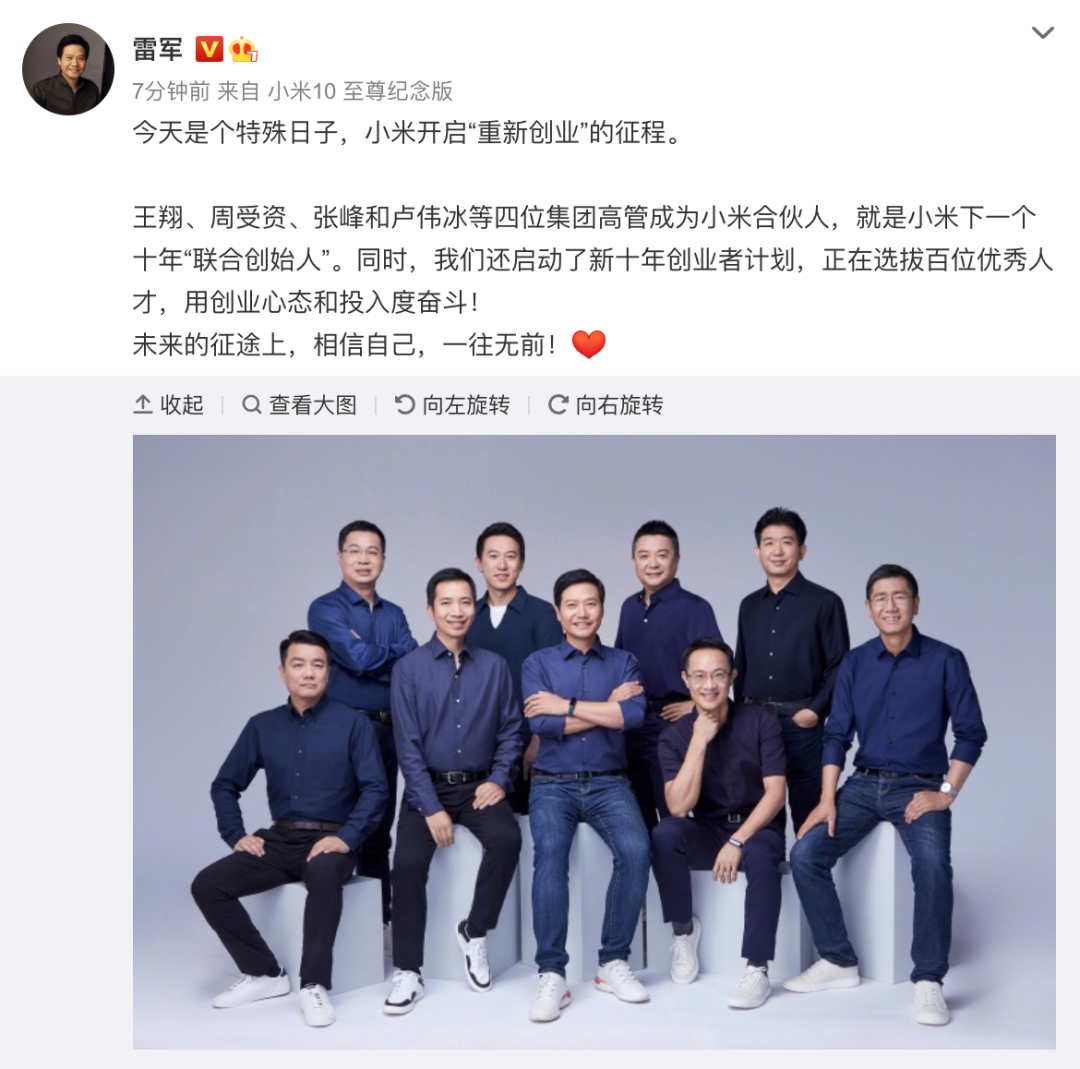雷达财经梳理发现,张峰不是小米唯一一位选择出走的合伙人。2020年8月,雷军曾官宣王翔、周受资、张峰、卢伟冰四位集团高管成为小米新的合伙人。