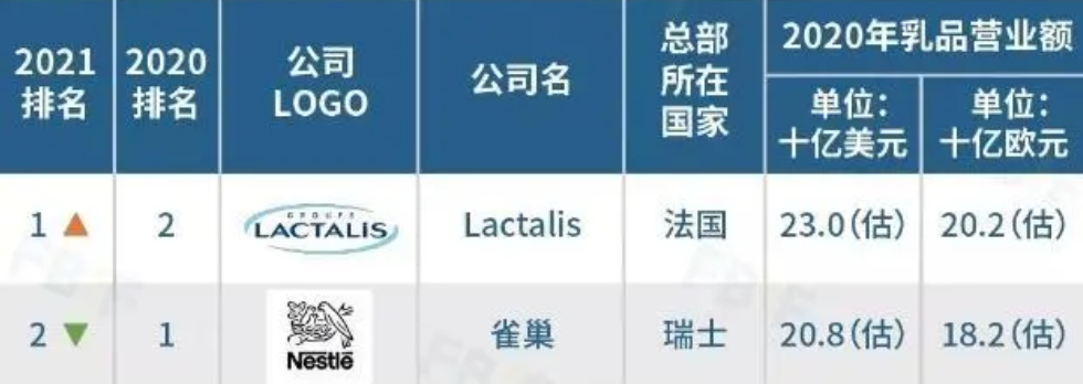 二十多年来,雀巢一直是排名第一的乳制品公司,2021年法国的兰特黎斯集团(英文:Lactalis)却一举超越雀巢,世界乳制品龙头宝座从此易主。