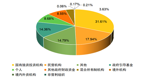 第三,国有资本成为“中流砥柱”。最大的资金筹集仍然来源于国有独资机构出资,政府引导基金、其它政府财政资金出资等,国有资本合计占比54.52%,同比增长6.22个百分点。我们还有很多准公共类的出资方,比如银行资本、保险资本、社保资本,如果将他们的出资数据也统计在内,国有资本就不是中流砥柱,而是半壁江山的势态。