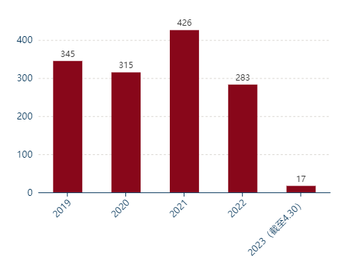 (2019-2023年(4月30日),美国VC对中国初创公司的风险投资交易数量,数据来源:Crunchbase)