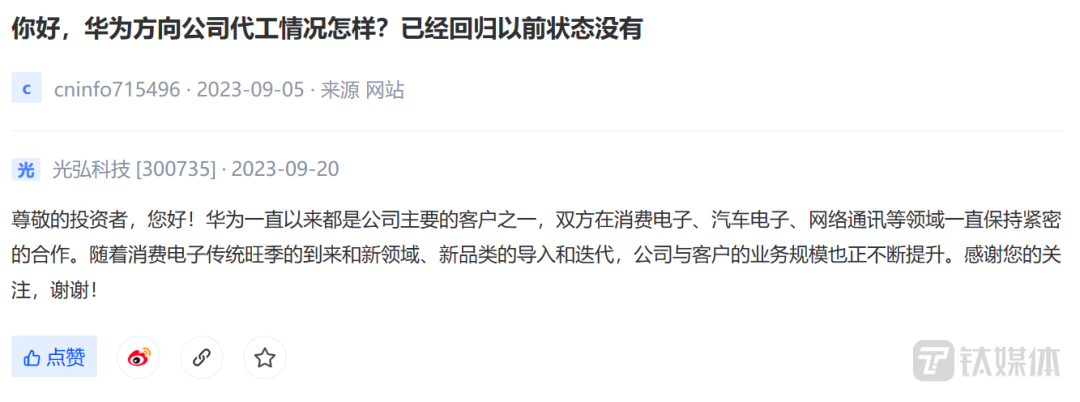此外,在股价还没起涨之前,公司亦向投资者表露和华为的关系。9月20日,公司突然在互动平台表示,华为一直以来都是公司主要的客户之一,双方在消费电子、汽车电子、网络通讯等领域一直保持紧密的合作。而公司股价刚好就开始从9月21日起持续上涨,至今最大涨幅已超106%。![]()