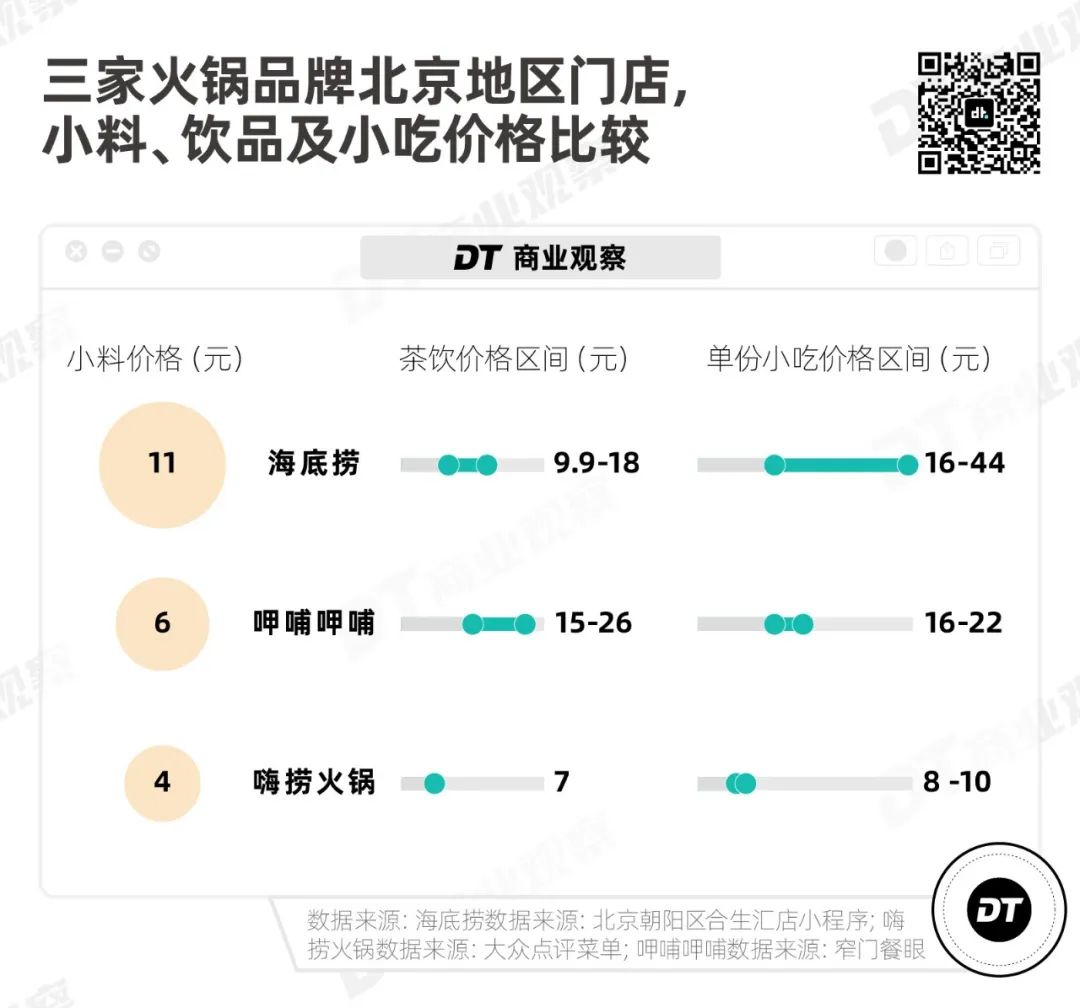 而嗨捞火锅4元的小料、7元的茶饮、以及低至8元起10元封顶的小吃,都是三家火锅品牌中最具有价格竞争力的。