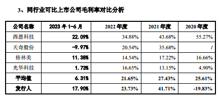 由于主产品毛利率的波动,报告期内,吉锐科技综合毛利率分别为-19.83%、41.71%、23.73%、17.9%,而公司同行可比公司毛利率的平均值分别为25.61%、27.43%、21.65%、6.31%。![]()