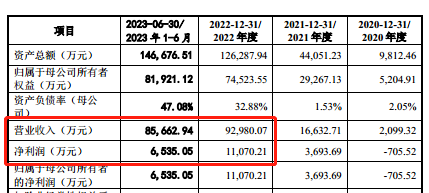 而2023年1-6月,吉锐科技的营业收入为85662.94万元,净利润为6535.05万元。拿这个数据与2022年全年比较可以发现,在营收相差7317.1万元的情况下,净利润却相差了4535.16万元(见下表)。![]()