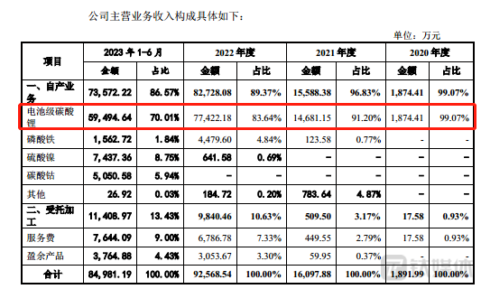 从产品上看,吉锐科技主要拥有电池级碳酸锂、磷酸铁、硫酸镍、碳酸钴等产品,其中2020年-2022年电池级碳酸锂产生的销售收入分别为1874.41万元、14681.15万元、77422.18万元,分别占当期主营业务收入的99.07%、91.2%、83.64%,年均复合增长率为542.69%。![]()