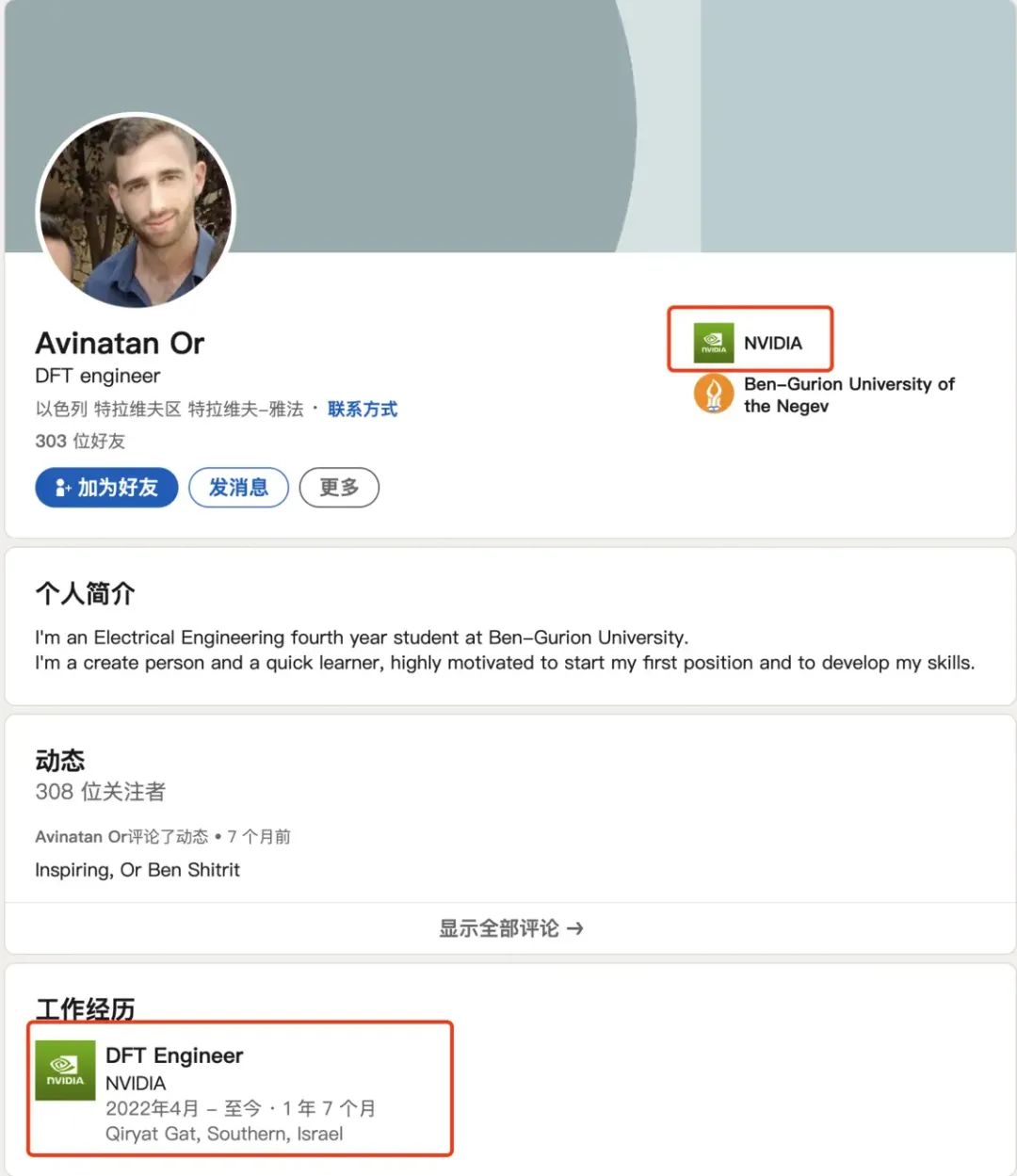 与此同时,领英上的资料显示,奥尔也曾在本·古里安大学就读,目前就是英伟达员工,再次证实了被绑架者的身份。领英显示,奥尔在个人介绍中称,自己是本·古里安大学电气工程专业的大四学生。从2022年4月开始,奥尔担任英伟达可测性设计工程师(DFT)。从教育经历中看出,奥尔已于2022年5月毕业。
