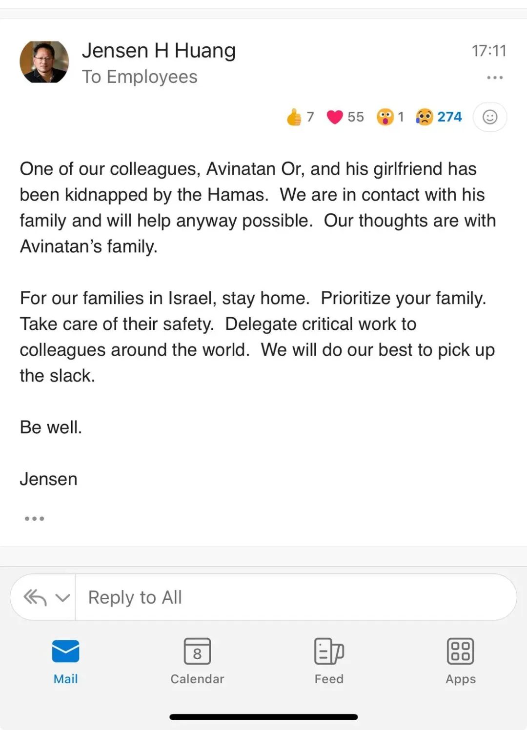 上周日,英伟达CEO黄仁勋(Jensen Huang)在一封发给全公司员工的电子邮件中分享了这一消息。他表示,“我们的同事奥尔及其女友已被哈马斯绑架”,公司正在与受影响员工的家人取得联系。邮件显示,黄仁勋对受到巴以冲突影响的员工表示:“将关键工作委托给我们世界各地的同事。我们会尽力弥补你们的空缺。”