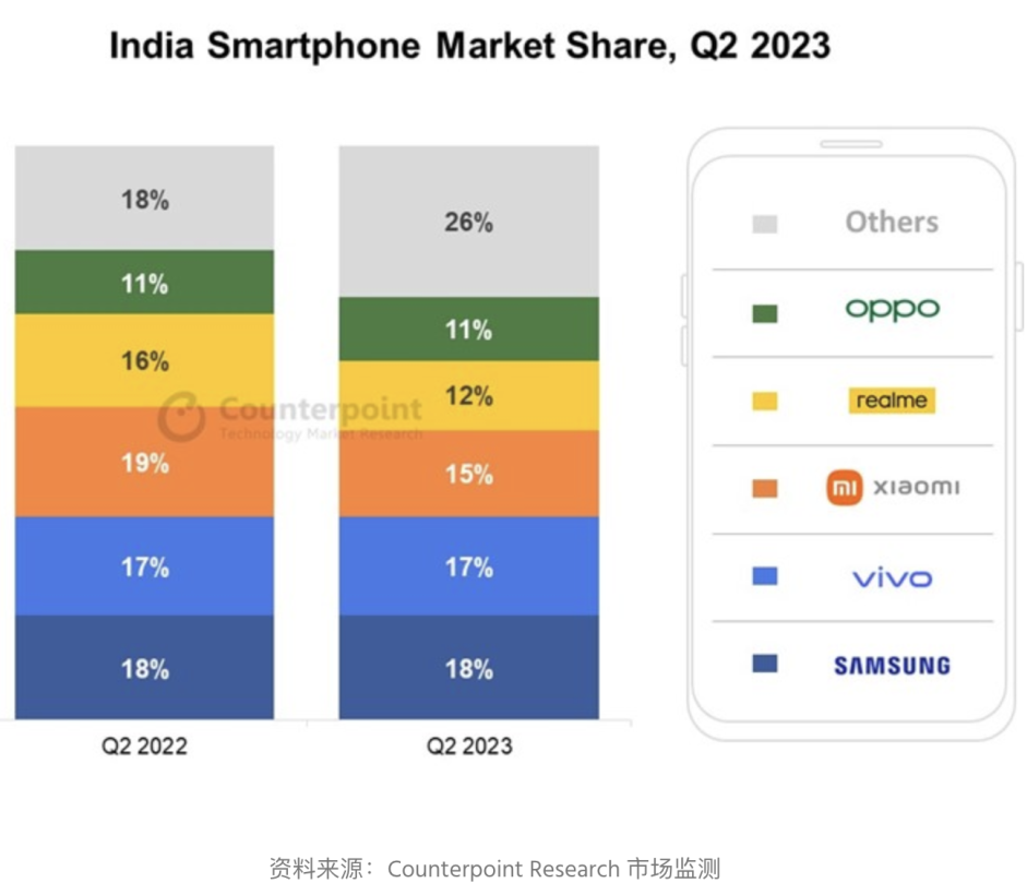 反观印度市场,今年二季度手机市场销量达到3610万部,同比仅下降1%,且环比增长18%。