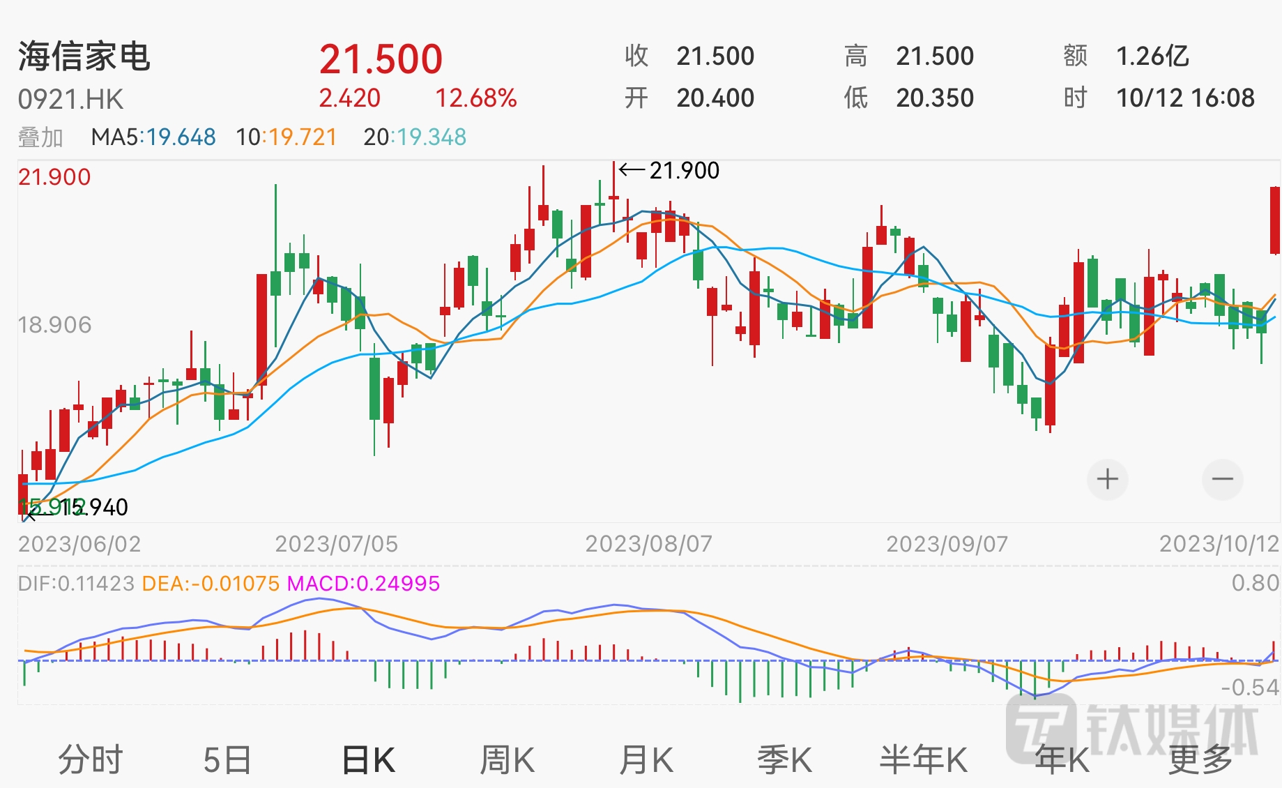 二级市场方面,10月12日,海信家电高开逾8%后波动向上,截至今天港股收盘,公司股价报收21.5港元,涨12.68%,成交额为1.26亿港元,当前公司总市值约298.45亿港元。(本文首发于钛媒体 APP,作者|陈伟纳)