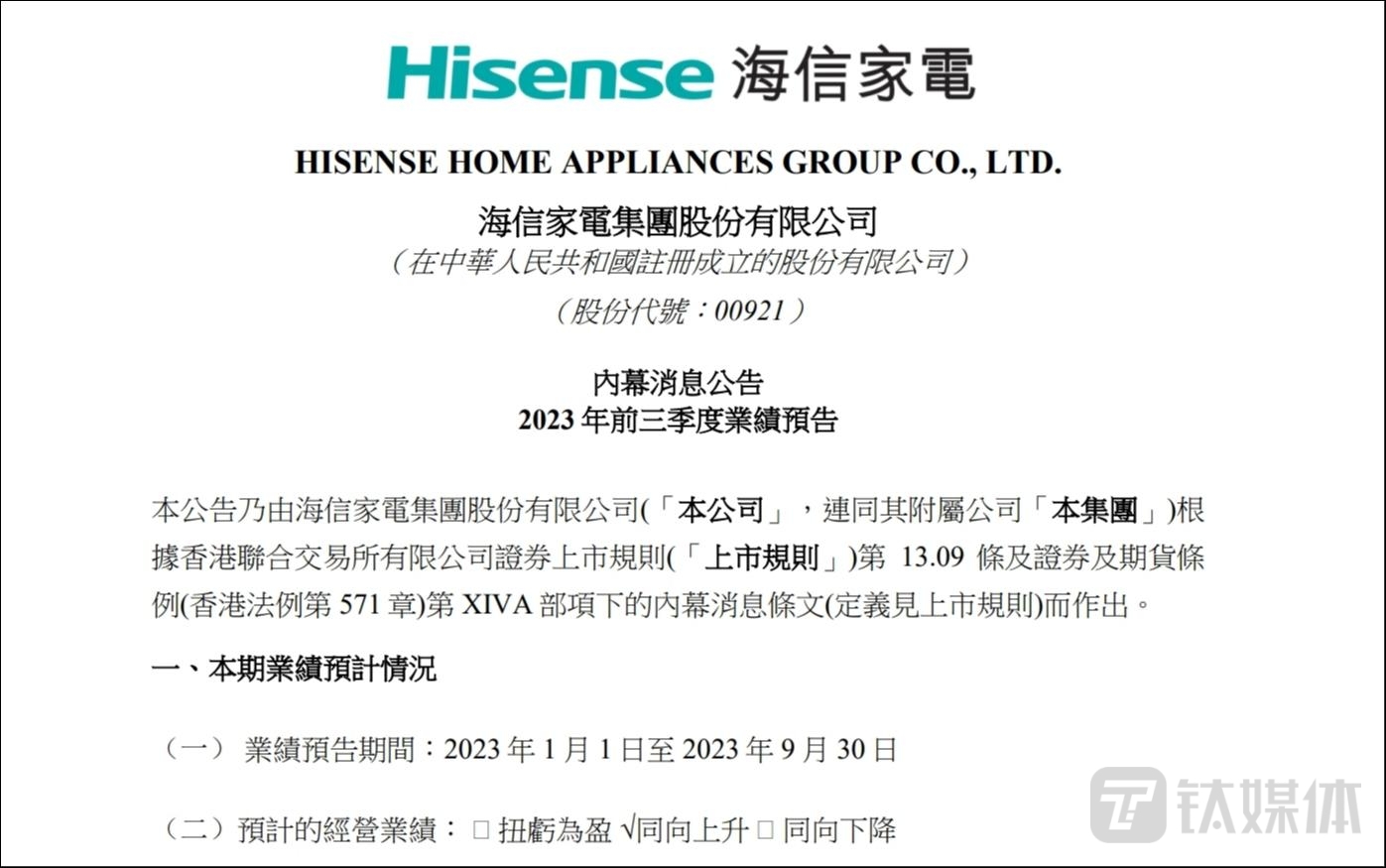 此外,国盛证券亦针对公司的盈利预告给出点评,称海信家电Q3业绩超预期,净利率环比持续改善。地产、外销复苏及空调大年下,该公司收入端增长稳健。对此,国盛证券认为,从全年看,海信家电的收入端具备经营韧性,盈利能力持续改善。