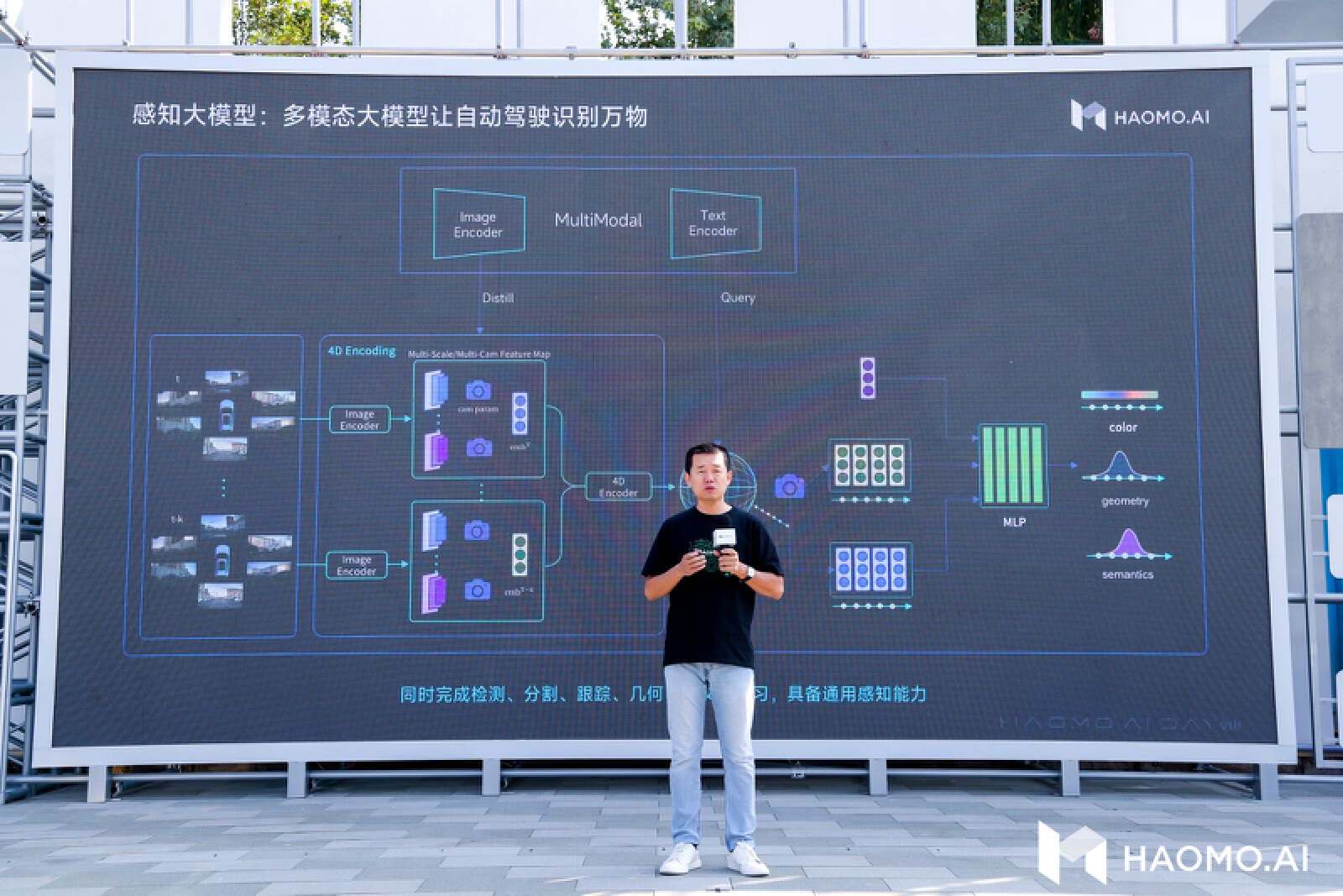 在构建对真实物理世界的 4D 感知基础上,毫末此次进一步引入开源的图文多模态大模型,构建更为通用的语义感知大模型,实现文、图、视频多模态信息的整合,从而完成 4D 向量空间到语义空间的对齐,实现跟人类一样的“识别万物”的能力。