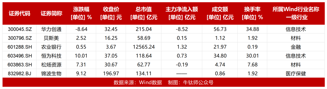 其中恒为科技10cm涨停,换手率30.01%,总市值118.64亿元;锦波生物上涨9.12%,换手率1.92%,总市值134.11亿元;华力创通换手率最高,全天换手率达34.88%,收跌8.64%。