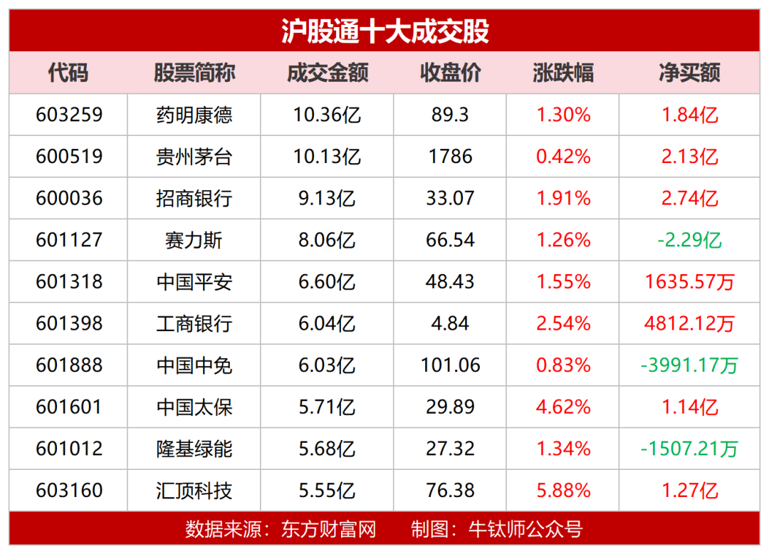 个股方面,沪股通成交额最高的个股为药明康德,达10.36亿元,净买入1.84亿元,收盘涨1.30%。其次是贵州茅台成交额为10.13亿元,净买入2.13亿元,收盘涨0.42%。