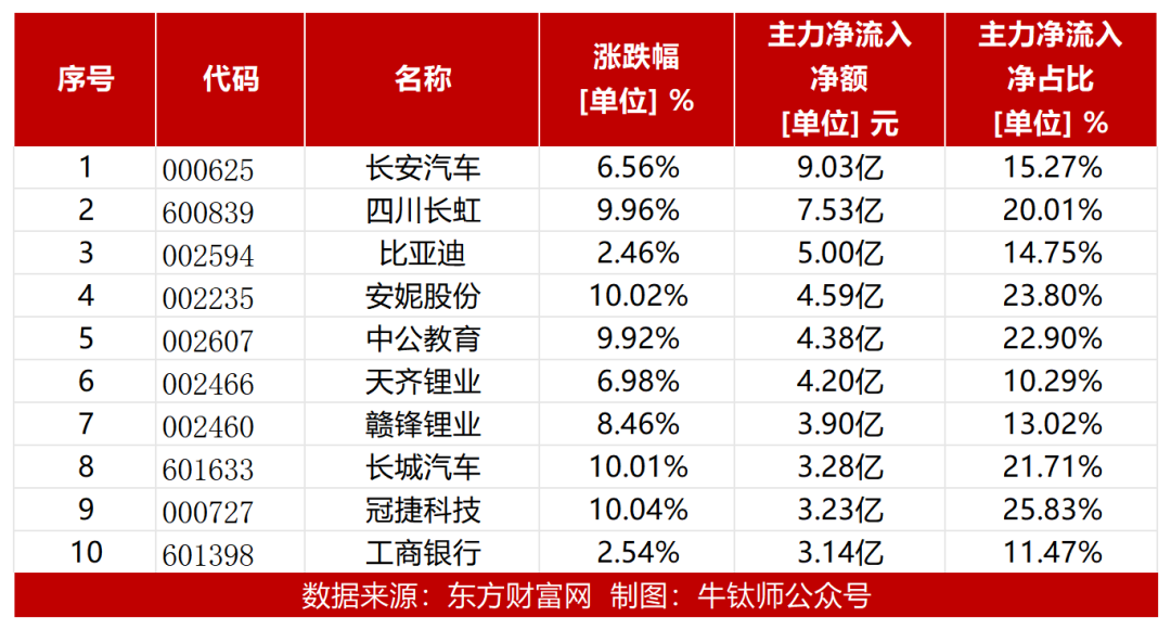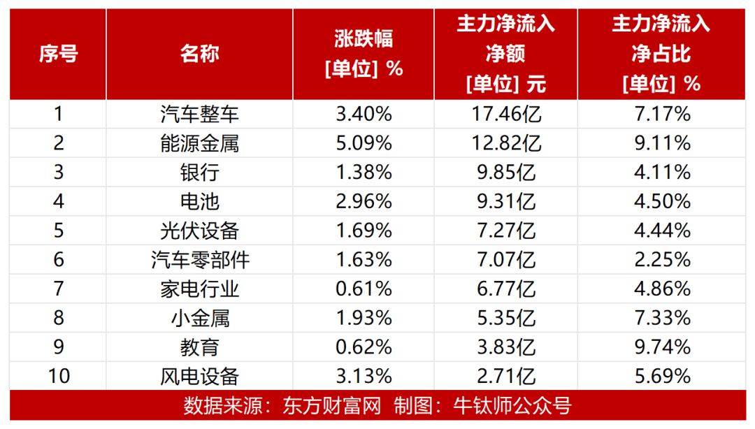 从行业板块来看:今日汽车整车板块资金流入规模最大,达17.46亿元,主力净流入净占比达到7.17%;其次是能源金属板块,主力净流入12.82亿元,净占比为9.11%;银行板块主力净流入9.85亿元,净占比为4.11%。