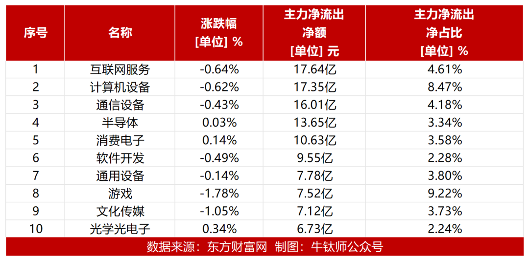 主力资金净流出前十板块中互联网服务、计算机设备和通信设备流出金额最多,分别为17.64亿元、17.35亿元和16.01亿元,此外半导体、消费电子、软件开发、通用设备、游戏、文化传媒、光学光电子板块同样资金流出规模居前。