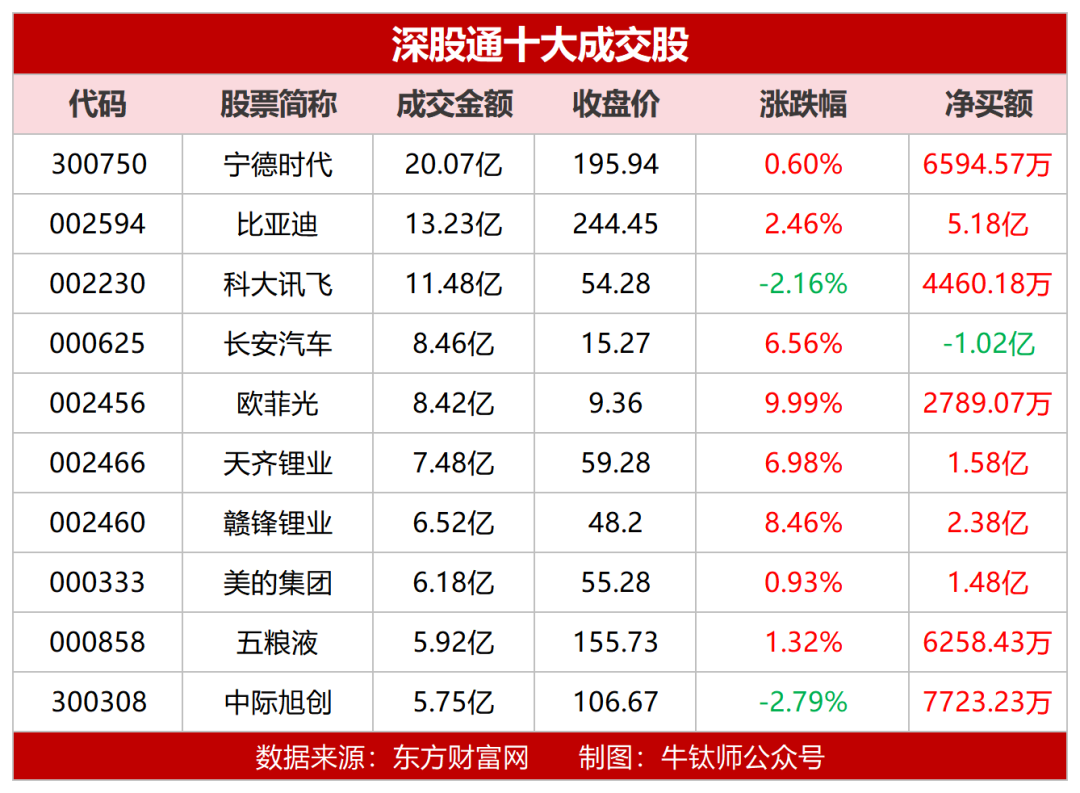 深股通成交额最高的个股为宁德时代,达20.07亿元,净买入6594.57万元,收盘涨0.60%。其次是比亚迪成交额为13.23亿元,净买入5.18亿元,收盘涨2.46%。