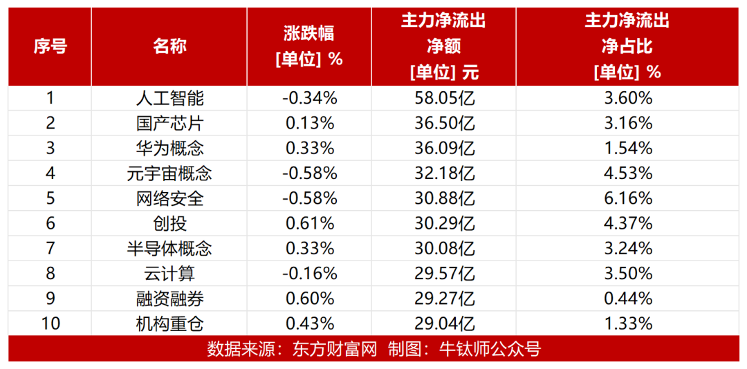 今日人工智能概念板块主力资金流出最多,国产芯片、华为概念、元宇宙概念、网络安全、创投、半导体概念、云计算、融资融券、机构重仓也是主力资金流出较多的板块。