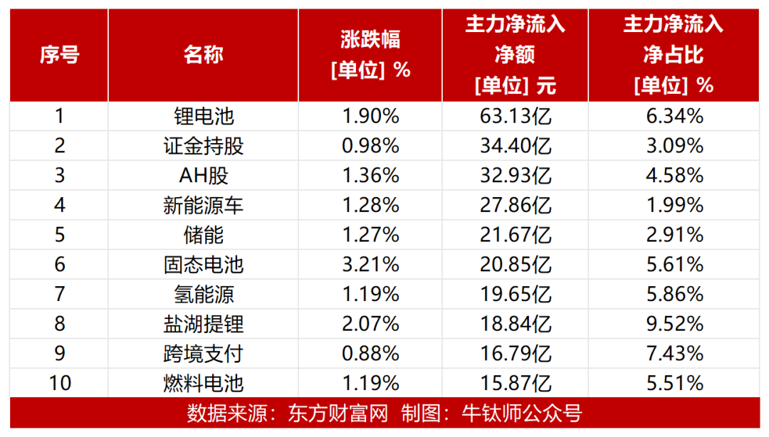从概念板块来看:今日新能源相关板块主力资金流入较大,锂电池概念板块主力资金净流入最多,达63.13亿元,新能源车、储能、固态电池净流入均超过20亿元,氢能源、盐湖提鲤、燃料电池概念板块净流入也较多。此外,证金持股、AH股净流入分别为34.40亿元和32.93亿元,跨境支付也是主力资金净流入较多的概念板块。
