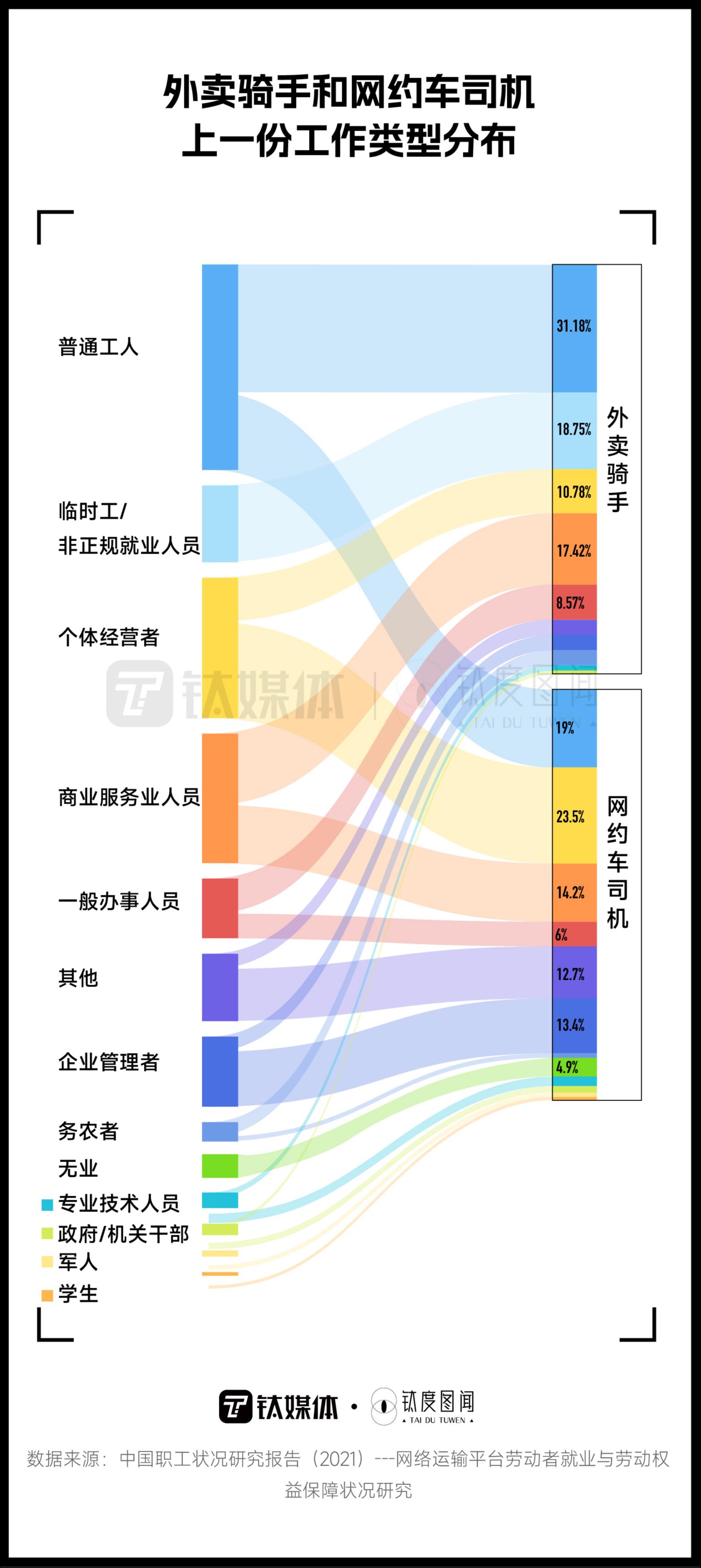 数据来源:魁阁学刊、中国就业发展报告(2022)、滴滴、中国职工状况研究报告(2021)、美团外卖骑手就业报告、美团社会责任报告、交通运输部等公开资料整理。