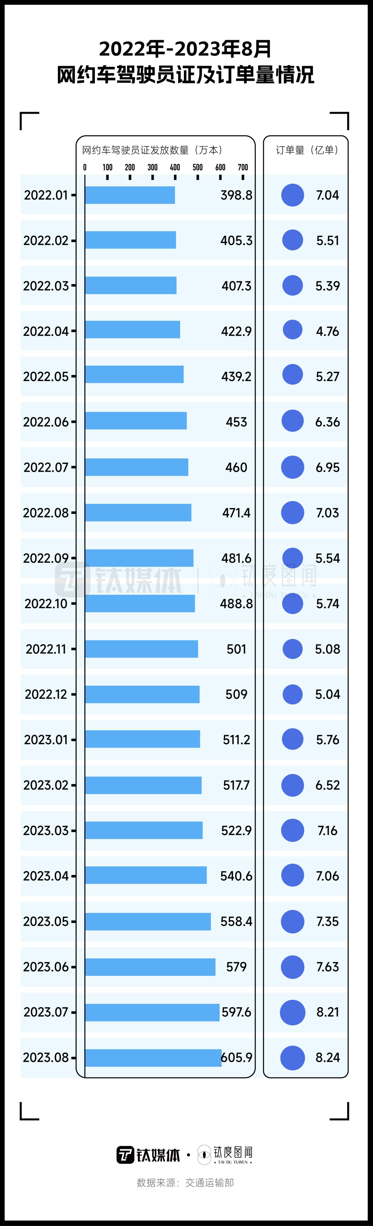 今年以来,随着居民出行加快恢复,其对网约车的需求也稳步上升。大量新司机持续涌入市场,让网约车市场变得越来越“卷”。2022年初,网约车驾驶员证发放数量为398.8万本,20个月后,这一数字已经上涨到605.9万本,涨幅为51.9%,也就是说,一年多的时间里,有207万个司机加入网约车行列。从2023年新发放的网约车驾驶员证数量来看,6月网约车驾驶员证数量增长最多,同比增加20.6万本,平均每天新增6867个网约车司机。对比2022年,去年5月新增加了16万本网约车驾驶员证,月新增数量为全年最多。由此可见,今年每个月新发放的网约车驾驶员证数量比去年增长不少。
