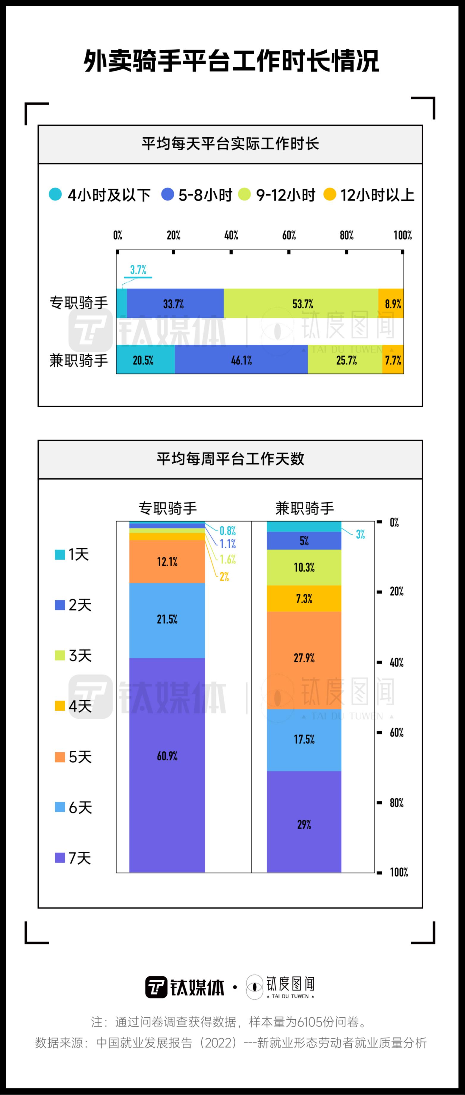 数据显示,有近一半的网约车司机每天工作时间长达12小时以上,近4成网约车司机一个月平均休息3-4天,而网约车司机的平均工资在5000-7000元/月之间;与之类似,一半以上的专职外卖骑手每天工作9-12小时,且几乎每周工作7天,薪资在5000-8000元/月之间。工作越来越累,赚钱越来越少,准入门槛较低的网约车司机、外卖骑手还是门好职业吗?本期钛媒体·钛度图闻从数据层面观察网约车司机、外卖骑手的生存现状。