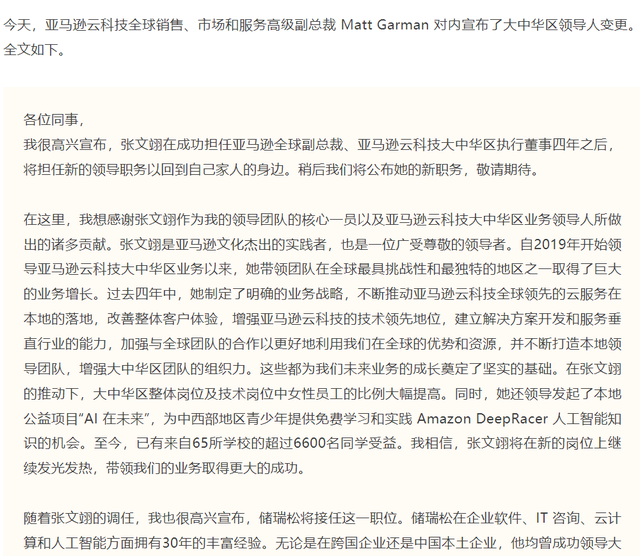 10 月 9 日,亚马逊云科技(AWS)宣布:储瑞松将接替张文翊,担任亚马逊全球副总裁、亚马逊云科技大中华区执行董事。