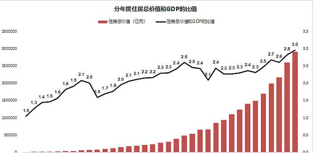 一般来说,一个国家房地产的总价值,相当于一个国家GDP的2-3倍,这是一条非常硬核的约束。1985年,中国这个比值只有1倍左右,随后逐年上升,大部分年份维持在2.3-2.5左右,从2015年开始这个比值有比较大幅度的提升,2019年这个比值接近3,但仍处于一个相对合理的范围内。