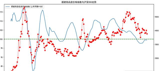 如果我们把新建商品房价格指数与沪深300走势做一张图,可以发现一个现象,那就是2006年开始的这波牛市,高点和低点刚好跟房价指数的高低位一一对应。而2013年以后,房价指数跟沪深300指数就可以逐渐背离,呈负相关的关系。