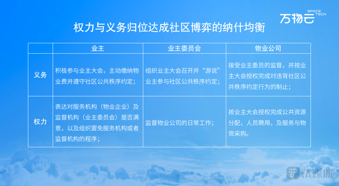 基于当前行业中存在的不良现象,万物云方面指出,权利与义务归位方能达成社区博弈的纳什均衡,并提出四大建议,包括:政府推动对业主共有产权保全义务的宣传;行业协会推动司法对“搭便车”行为建立快速裁决机制;政府推动业主委员会机制的更新;物业公司要以“阳光物业”为目标,接受监督并行为自律。