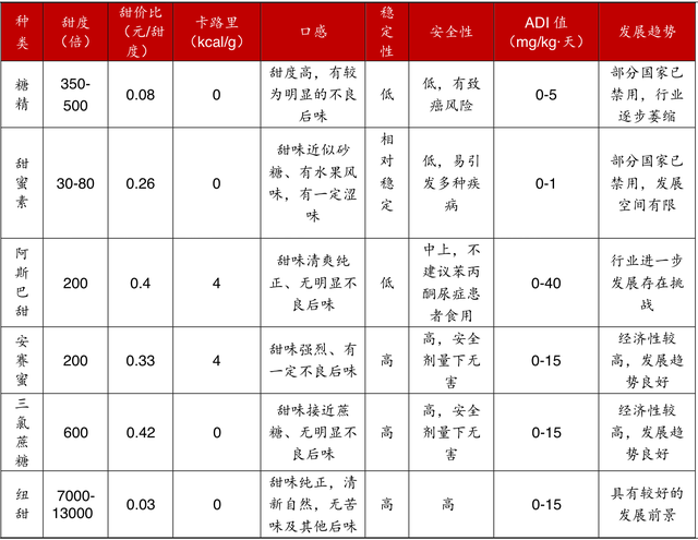 “甜价比”代表单位蔗糖价格下,能够实现的相对于蔗糖的甜度倍数。2021年蔗糖、安赛蜜和三氯蔗糖的甜价比分别为0.19、2.89、2.39(甜度/元)。相当于一瓶饮料中如果蔗糖的成本为0.2元,换成三氯蔗糖只需要0.016元,换成安赛蜜只需要0.013元。