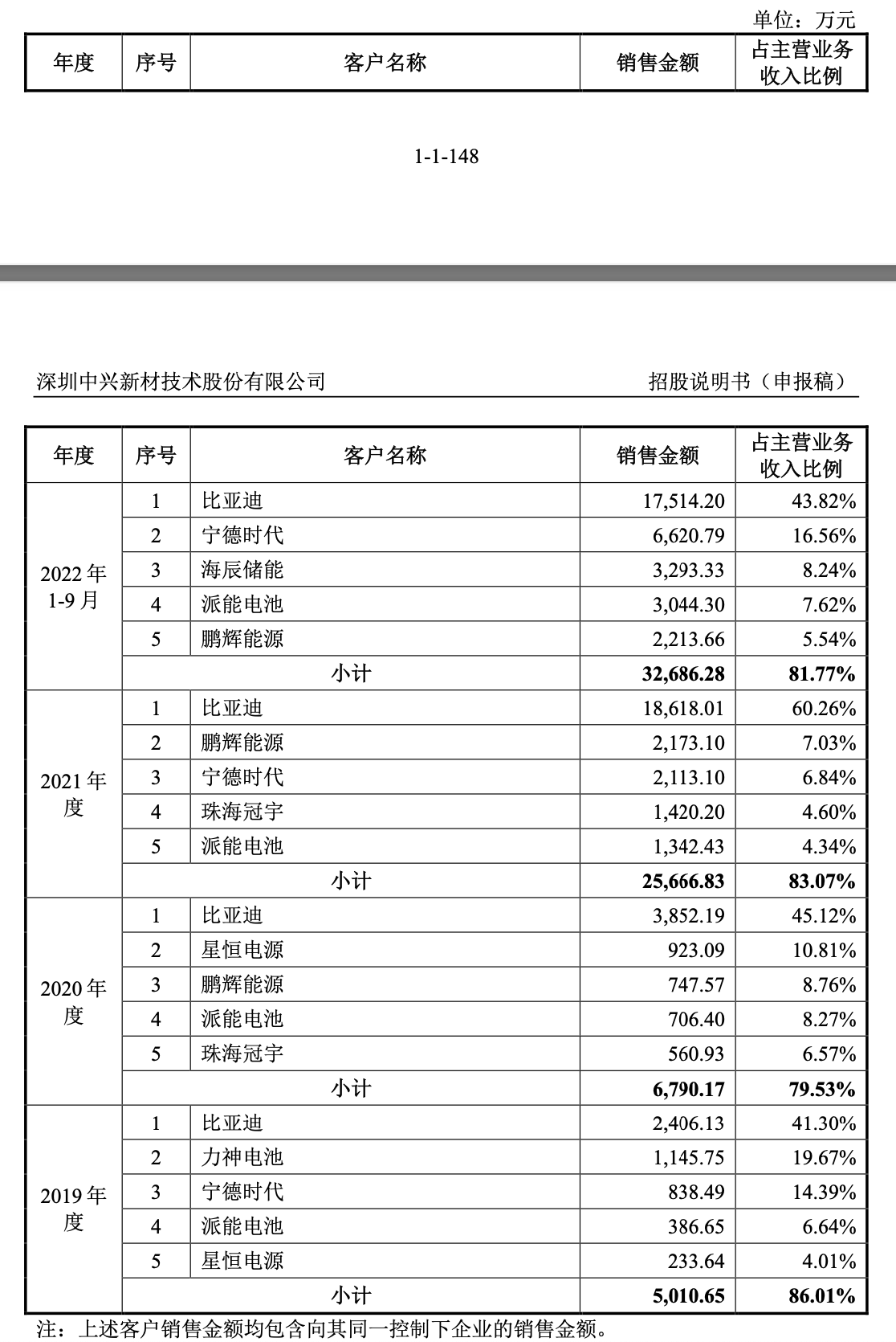 此外,2017年,中兴新材干法隔膜成功导入宁德时代,并与该等客户保持长期深度的合作关系。招股书显示,2021年及2022年前三季度,宁德时代分别是公司第三和第二大客户,交易额分别为0.21亿、0.66亿元,占比分别为6.84%、16.56%。