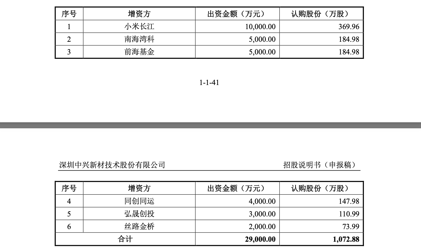 2022年3月,中兴新材完成第三次增资。其中,小米长江出资1亿元,认购369.96万股股份,增资价格为27.03元/股。