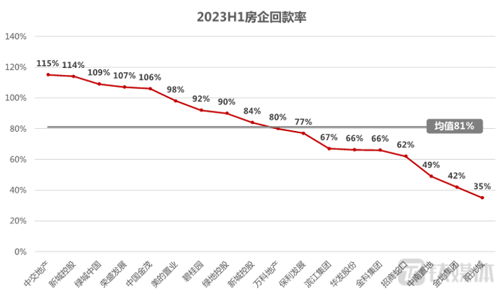 根据易居研究院及365财经发布数据统计,2023上半年共计18家房企披露回款数据,18家房企回款率平均值为81%。