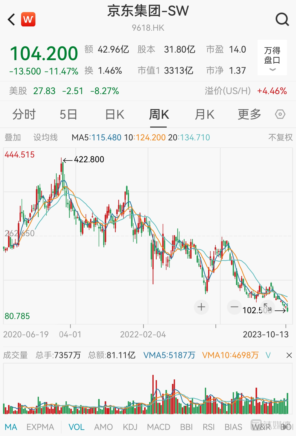 截至10月13日港股收盘,京东集团-SW股价报收104.2港元,跌11.47%,成交额为42.96亿港元,当前公司总市值约3313.22亿港元。