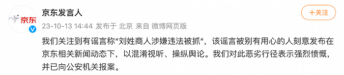 随后,@京东发言人 在微博发言称,关注到有谣言称“刘姓商人涉嫌违法被抓”,该谣言被别有用心的人可以发布在京东相关新闻动态下,以混淆视听、操纵舆论。公司对此恶劣行径表示强烈愤慨,并已向公安机关报案。(本文首发于钛媒体 APP,作者|陈伟纳)