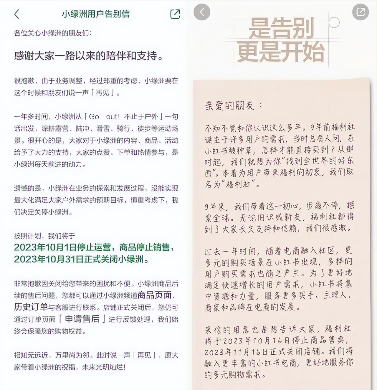 再有是壮士断腕,砍掉不赚钱的自营电商业务。近日,内容社区平台小红书自营电商业务“小绿洲”发布用户告别信,同时已于今年10月1日停止运营,商品停止销售,并于10月31日正式关闭。之后,9月15日,小红书再发声明称,将于11月16日正式关闭其直营电商平台“福利社”。自此,小红书自营电商平台将全部关闭。截至停止运营时间,小绿洲运营时间不足2年,福利社已持续运营近9年。