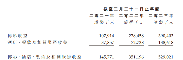 其中,博彩是百乐皇宫最核心的业务,2023财年占公司营收比例超过70%。2021财年百乐皇宫博彩收入仅为1.08亿港元,到2023财年暴涨至3.90亿港元,三年内大涨261%。