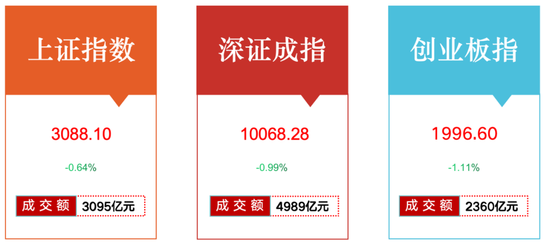 今日,沪指报3088.10点,跌0.64%;深成指报10068.28点,跌0.99%;创业板指报1996.60点,跌1.11%。两市全天成交额8084亿元,较上一交易日缩量229亿元,超3800股下跌。今日,北上资金净流出37.28亿元、净卖出64.38亿元。