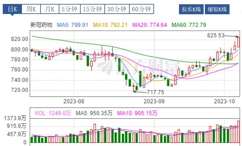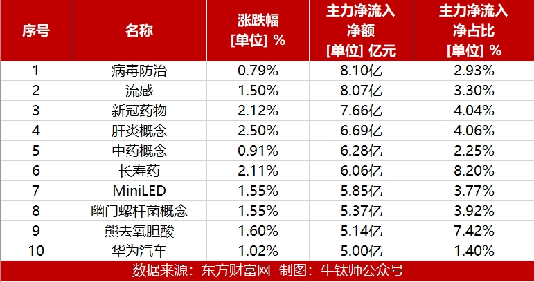 从概念板块来看:今日病毒防治、流感和新冠药物板块获主力资金流入较多,流入净额分别为8.10亿元、8.07亿元和7.66亿元,另外,肝炎概念、中药概念、长寿药、MiniLED、幽门螺旋杆菌、熊去氧胆酸和华为汽车也是主力资金流入较多的概念板块。