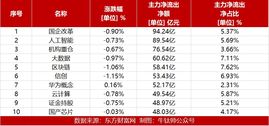 今日国企改革概念板块主力资金流出最多,流出净额达94.24亿元。紧随其后的是人工智能和机构重仓,流出净额为89.54亿元和76.54亿元。大数据、区块链、信创、华为概念、云计算、证金持股和国产芯片也是主力资金流出较多的板块。