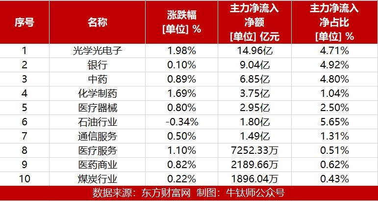 从行业板块来看:光学光电子流入规模最大,达14.96亿元,主力净流入净占比为4.71%,其次是银行,主力净流入9.04亿,中药主力净流入6.85亿,另外,化学制药、医疗器械、石油行业和通信服务板块主力净流入均超1亿元。