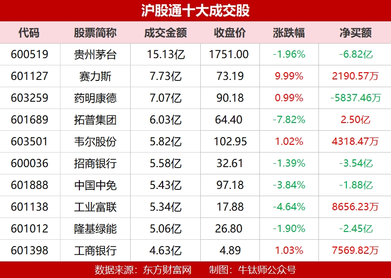 个股方面,沪股通成交额最高的个股为贵州茅台,成交额达15.13亿元,净卖出6.82亿元,收盘跌1.96%。其次是赛力斯,成交额为7.73亿元,净买入2190.57万元,收盘涨9.99%。