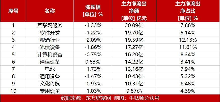 主力资金净流出前十板块中互联网服务、软件开发和酿酒行业流出金额最多,分别为30.09亿元、19.70亿元和19.59亿元,此外光伏设备、计算机设备、通信设备、电池、通用设备、文化传媒及专用设备板块同样资金流出规模居前。