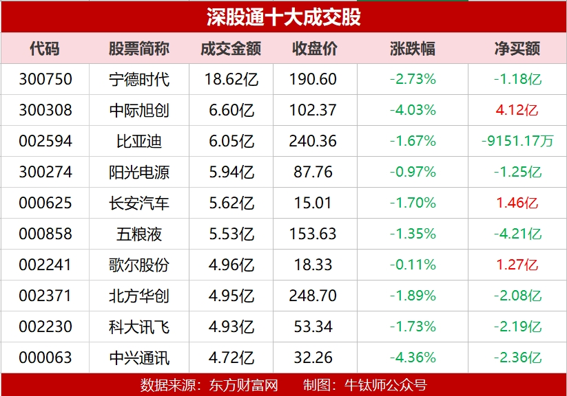 深股通成交额最高的个股为宁德时代,成交额达18.62亿元,净卖出1.18亿元,收盘跌2.73%。其次是中际旭创,成交额为6.60元,净买入4.12亿元,收跌4.03%。比亚迪成交额6.05亿元,净卖出9151.17万元,收盘跌1.67%。