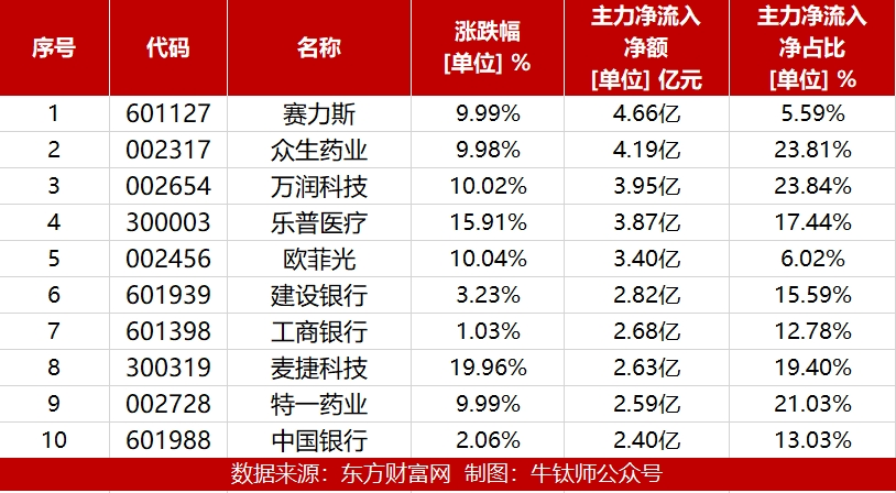 从个股来看,今日有1645只个股获主力资金净流入,32只个股获主力资金净流入超1亿元。其中,赛力斯获主力资金净流入最多,净流入金额为4.66亿元。